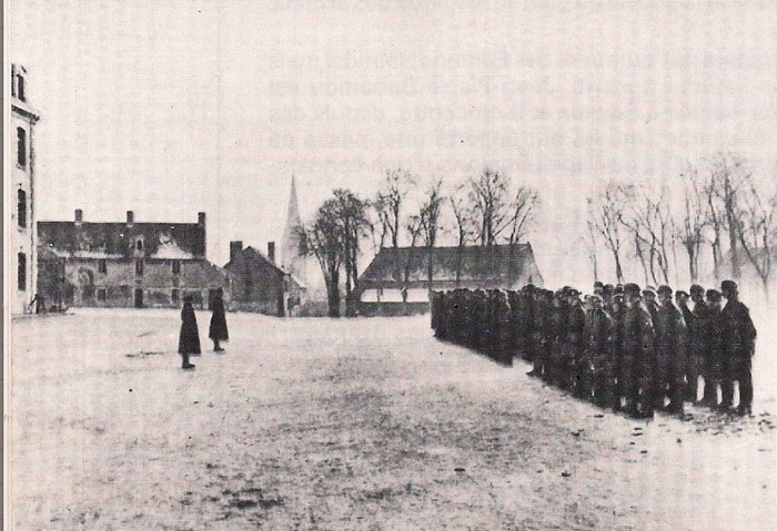 Source: photo présentée page 7 de ce livre, les Allemands rue des Jacobins devant le porche de la Sainte Famille, institution tenue par des religieuses, pour jeunes filles seules et nécessitantes, repas du midi et du soir avec un dortoir.