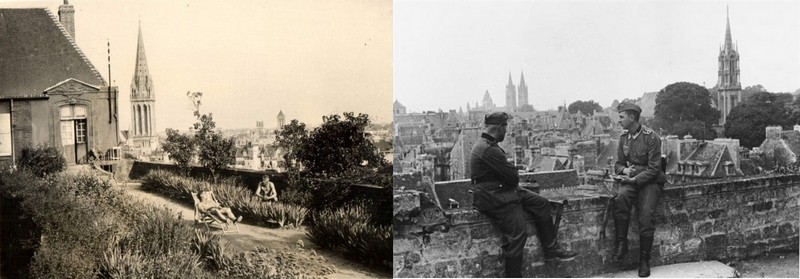 Des Allemands dans le château. A gauche le clocher de Saint Pierre. A droite photo Bundesarchiv. Deux soldats allemands sur le rempart ouest surplombant la rue de Geôle, les deux clochers dans le lointain sont ceux de Saint Etienne et celui à droite est celui des Bénédictines rue Elie de Beaumont. Voir 4 ans plus tard en juillet 1944. Des graffitis photographiés en 2011.