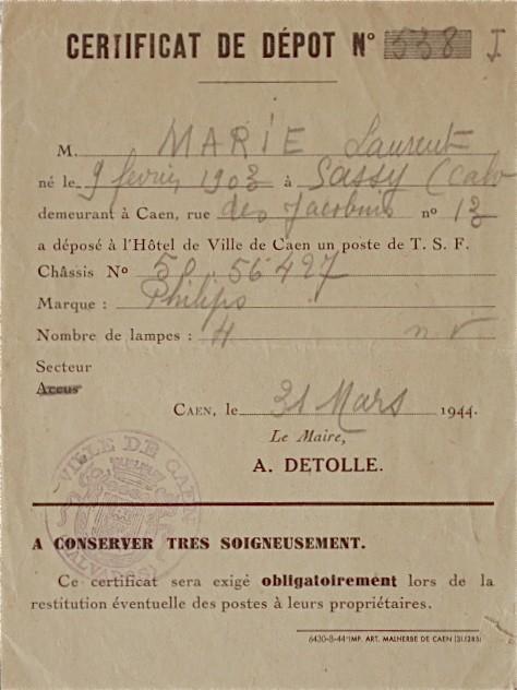M. Laurent Marie dépose, le 31 mars 1944, à l'Hôtel de ville, son poste de TSF Philips